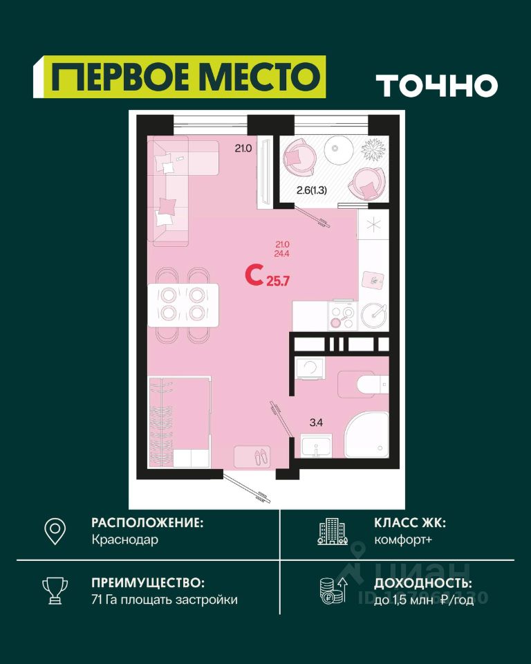 Жилой район ''Первое место''- один из самых масштабных проектов в России. На территории 71 га 18 кварталов, 31 дом переменной этажности от 8 до 18 этажей, собственный парк 9 га, храмовый комплекс, пешеходный бульвар ''Круг семьи'', детские и спортивные площадки, мангальные зоны и различные локации для отдыха. В шаговой доступности действующие муниципальные образовательные учреждения: школа на 1 100 мест и детский сад на 250 мест. Помимо этого, в жилом районе ''Первое место'' построятся школа на 1700 мест с крытым 25-метровым бассейном и 5 детских садов на 1 490 мест. На первых этажах многоуровневых парковок ''паркхабов'' разместится более 61 тыс м2 коммерческих помещений. Жителям будут доступны собственный фитнес-центр, кафе, рестораны и магазины. В каждом подъезде предусмотрены дизайнерские холлы в стиле лобби отелей, консьерж-сервис, лапомойки, отдельные колясочные и велосипедные. Также в домах будут просторные кладовые помещения и комнаты для хранения почты с почтоматами для получения посылок из маркетплейсов.