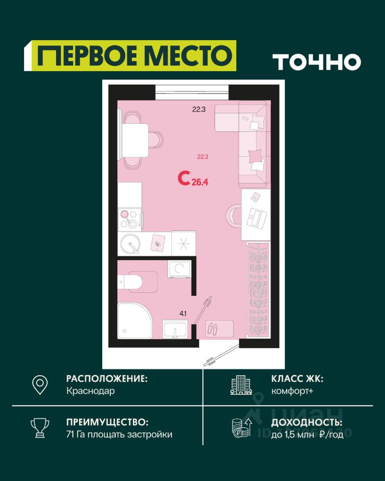 Жилой район ''Первое место''- один из самых масштабных проектов в России. На территории 71 га 18 кварталов, 31 дом переменной этажности от 8 до 18 этажей, собственный парк 9 га, храмовый комплекс, пешеходный бульвар ''Круг семьи'', детские и спортивные площадки, мангальные зоны и различные локации для отдыха. В шаговой доступности действующие муниципальные образовательные учреждения: школа на 1 100 мест и детский сад на 250 мест. Помимо этого, в жилом районе ''Первое место'' построятся школа на 1700 мест с крытым 25-метровым бассейном и 5 детских садов на 1 490 мест. На первых этажах многоуровневых парковок ''паркхабов'' разместится более 61 тыс м2 коммерческих помещений. Жителям будут доступны собственный фитнес-центр, кафе, рестораны и магазины. В каждом подъезде предусмотрены дизайнерские холлы в стиле лобби отелей, консьерж-сервис, лапомойки, отдельные колясочные и велосипедные. Также в домах будут просторные кладовые помещения и комнаты для хранения почты с почтоматами для получения посылок из маркетплейсов.