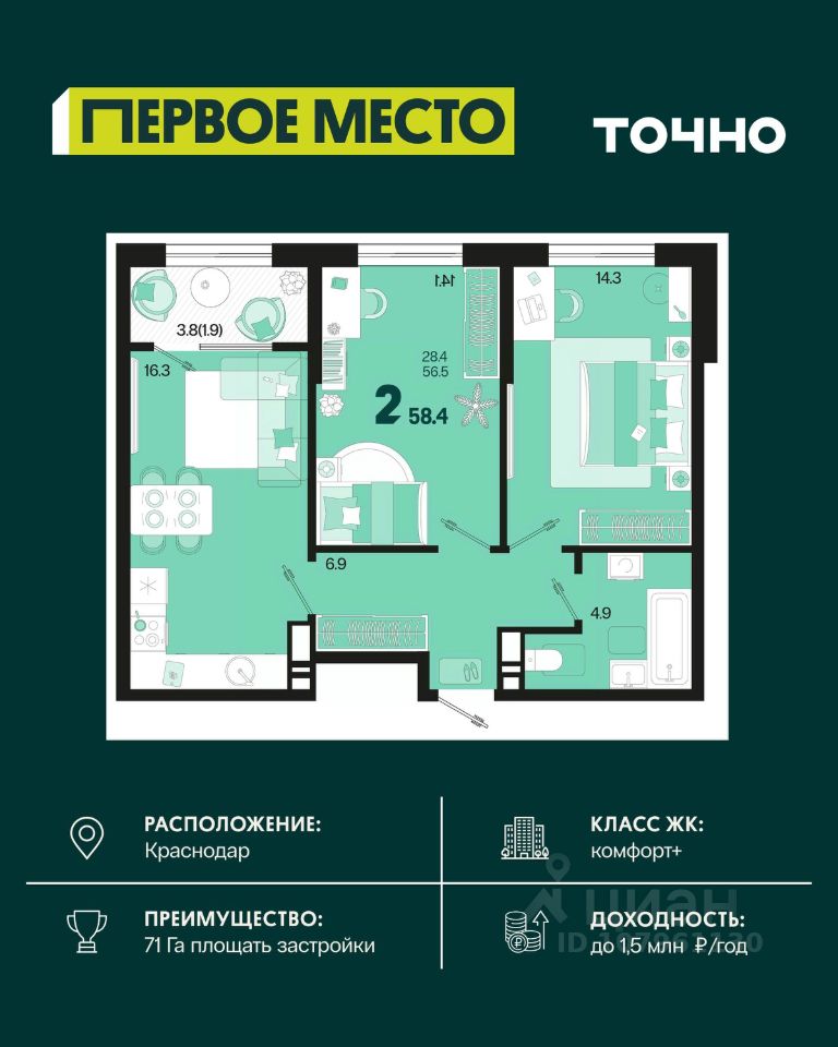 продам 2-к, Виктора Казанцева, 1.58 760 000 ₽