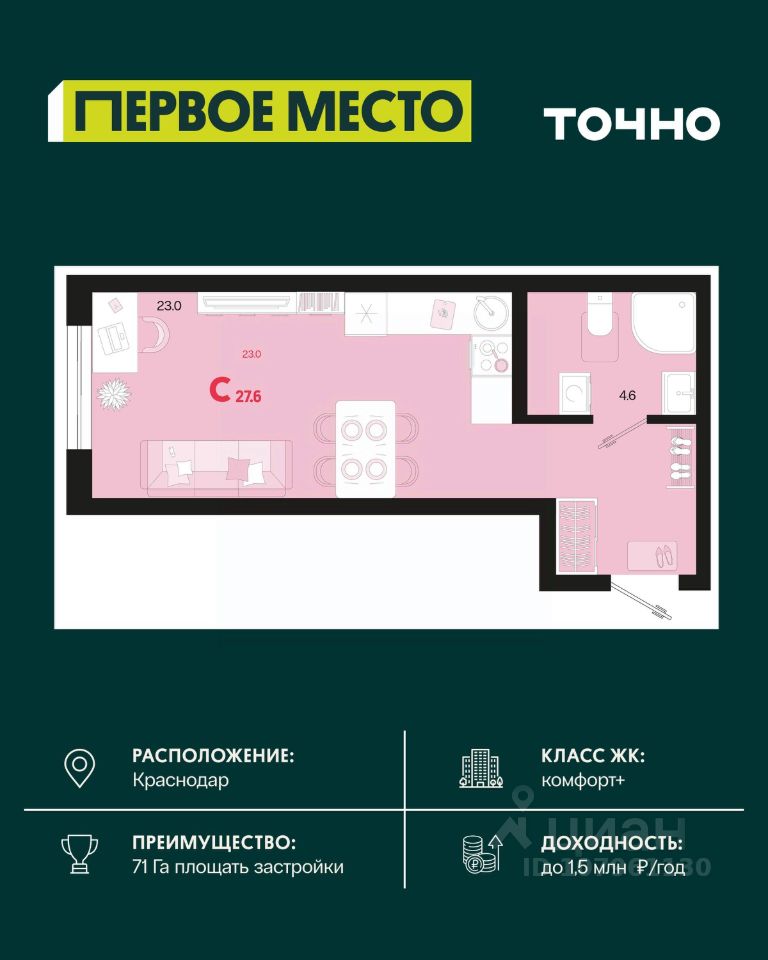 Жилой район ''Первое место''- один из самых масштабных проектов в России. На территории 71 га 18 кварталов, 31 дом переменной этажности от 8 до 18 этажей, собственный парк 9 га, храмовый комплекс, пешеходный бульвар ''Круг семьи'', детские и спортивные площадки, мангальные зоны и различные локации для отдыха. В шаговой доступности действующие муниципальные образовательные учреждения: школа на 1 100 мест и детский сад на 250 мест. Помимо этого, в жилом районе ''Первое место'' построятся школа на 1700 мест с крытым 25-метровым бассейном и 5 детских садов на 1 490 мест. На первых этажах многоуровневых парковок ''паркхабов'' разместится более 61 тыс м2 коммерческих помещений. Жителям будут доступны собственный фитнес-центр, кафе, рестораны и магазины. В каждом подъезде предусмотрены дизайнерские холлы в стиле лобби отелей, консьерж-сервис, лапомойки, отдельные колясочные и велосипедные. Также в домах будут просторные кладовые помещения и комнаты для хранения почты с почтоматами для получения посылок из маркетплейсов.