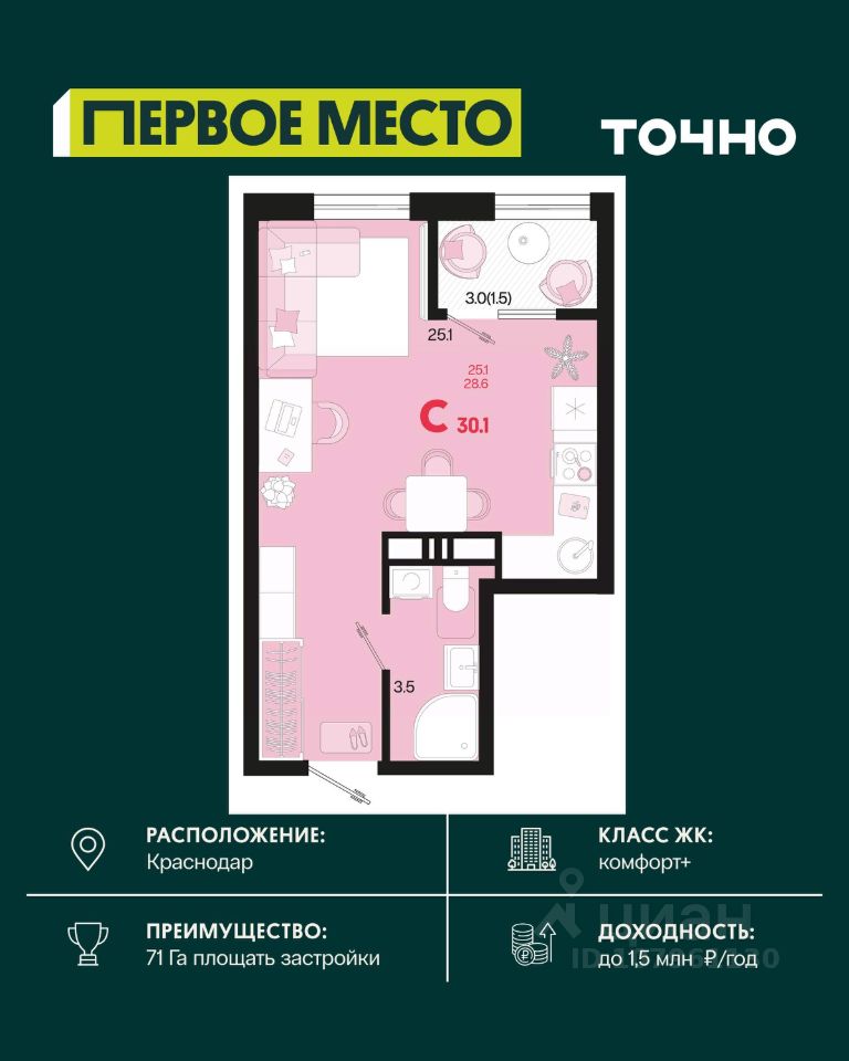 Жилой район ''Первое место''- один из самых масштабных проектов в России. На территории 71 га 18 кварталов, 31 дом переменной этажности от 8 до 18 этажей, собственный парк 9 га, храмовый комплекс, пешеходный бульвар ''Круг семьи'', детские и спортивные площадки, мангальные зоны и различные локации для отдыха. В шаговой доступности действующие муниципальные образовательные учреждения: школа на 1 100 мест и детский сад на 250 мест. Помимо этого, в жилом районе ''Первое место'' построятся школа на 1700 мест с крытым 25-метровым бассейном и 5 детских садов на 1 490 мест. На первых этажах многоуровневых парковок ''паркхабов'' разместится более 61 тыс м2 коммерческих помещений. Жителям будут доступны собственный фитнес-центр, кафе, рестораны и магазины. В каждом подъезде предусмотрены дизайнерские холлы в стиле лобби отелей, консьерж-сервис, лапомойки, отдельные колясочные и велосипедные. Также в домах будут просторные кладовые помещения и комнаты для хранения почты с почтоматами для получения посылок из маркетплейсов.