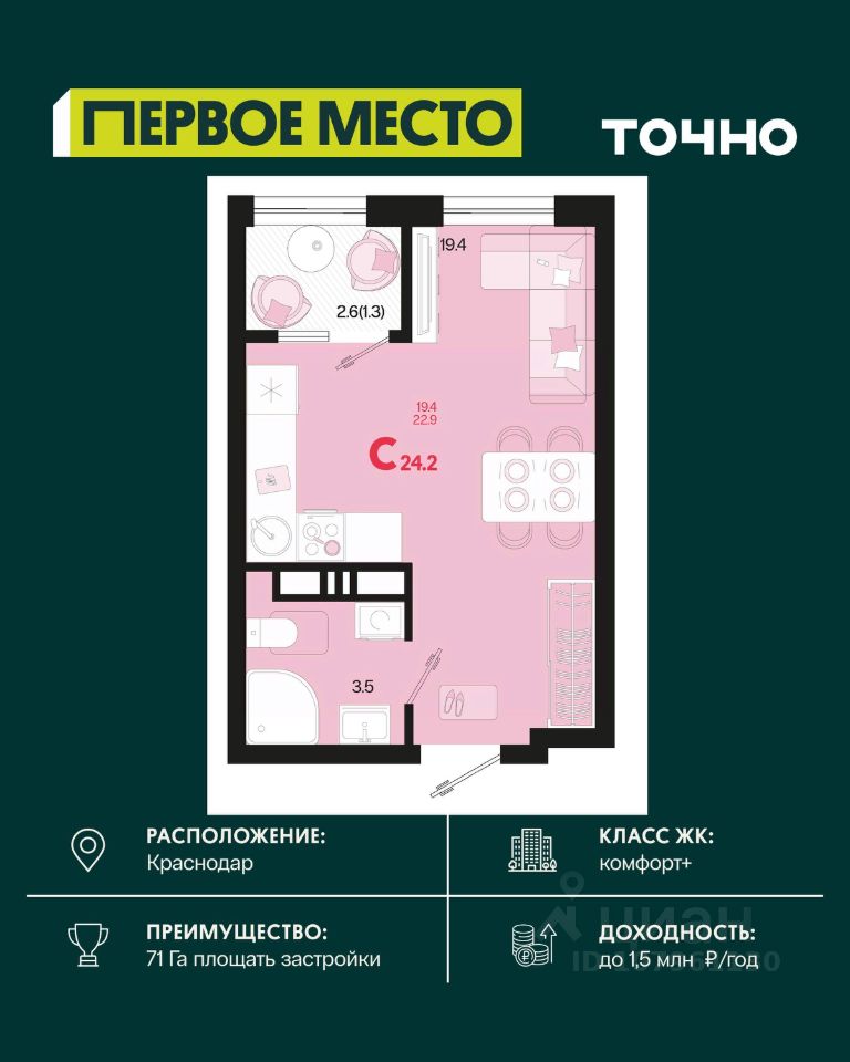 Жилой район ''Первое место''- один из самых масштабных проектов в России. На территории 71 га 18 кварталов, 31 дом переменной этажности от 8 до 18 этажей, собственный парк 9 га, храмовый комплекс, пешеходный бульвар ''Круг семьи'', детские и спортивные площадки, мангальные зоны и различные локации для отдыха. В шаговой доступности действующие муниципальные образовательные учреждения: школа на 1 100 мест и детский сад на 250 мест. Помимо этого, в жилом районе ''Первое место'' построятся школа на 1700 мест с крытым 25-метровым бассейном и 5 детских садов на 1 490 мест. На первых этажах многоуровневых парковок ''паркхабов'' разместится более 61 тыс м2 коммерческих помещений. Жителям будут доступны собственный фитнес-центр, кафе, рестораны и магазины. В каждом подъезде предусмотрены дизайнерские холлы в стиле лобби отелей, консьерж-сервис, лапомойки, отдельные колясочные и велосипедные. Также в домах будут просторные кладовые помещения и комнаты для хранения почты с почтоматами для получения посылок из маркетплейсов.