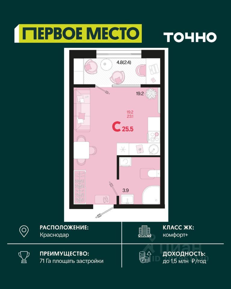 Жилой район ''Первое место''- один из самых масштабных проектов в России. На территории 71 га 18 кварталов, 31 дом переменной этажности от 8 до 18 этажей, собственный парк 9 га, храмовый комплекс, пешеходный бульвар ''Круг семьи'', детские и спортивные площадки, мангальные зоны и различные локации для отдыха. В шаговой доступности действующие муниципальные образовательные учреждения: школа на 1 100 мест и детский сад на 250 мест. Помимо этого, в жилом районе ''Первое место'' построятся школа на 1700 мест с крытым 25-метровым бассейном и 5 детских садов на 1 490 мест. На первых этажах многоуровневых парковок ''паркхабов'' разместится более 61 тыс м2 коммерческих помещений. Жителям будут доступны собственный фитнес-центр, кафе, рестораны и магазины. В каждом подъезде предусмотрены дизайнерские холлы в стиле лобби отелей, консьерж-сервис, лапомойки, отдельные колясочные и велосипедные. Также в домах будут просторные кладовые помещения и комнаты для хранения почты с почтоматами для получения посылок из маркетплейсов.
