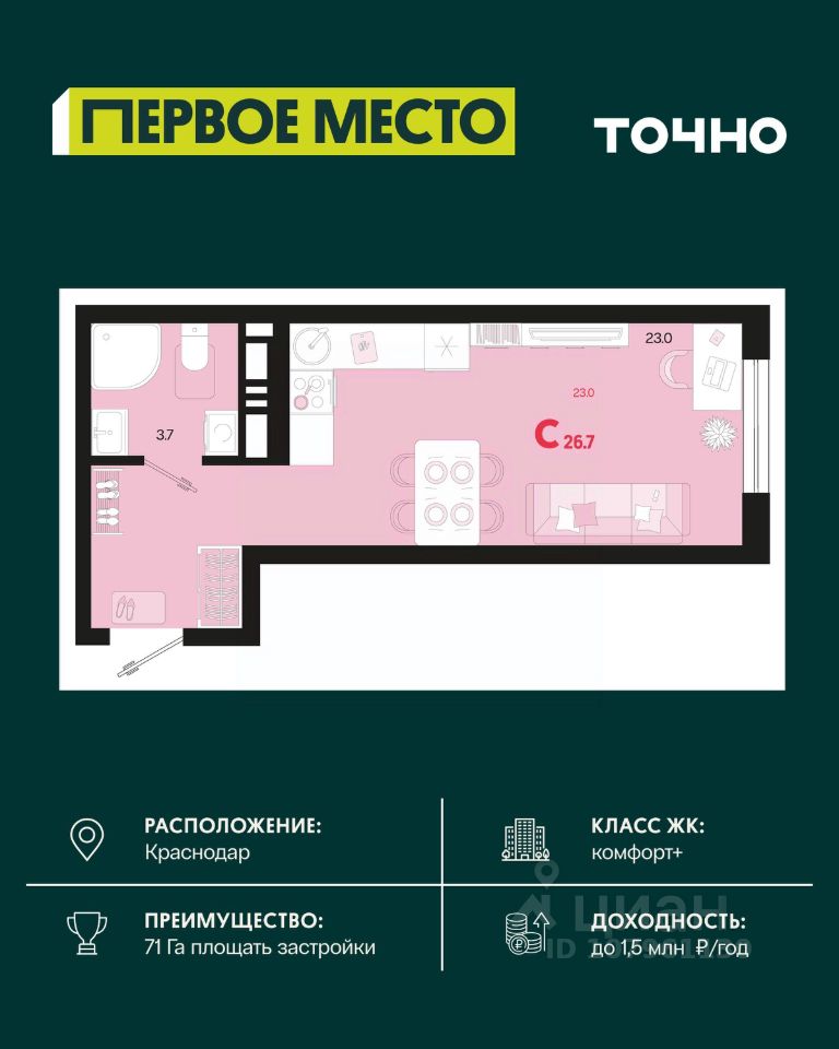 Жилой район ''Первое место''- один из самых масштабных проектов в России. На территории 71 га 18 кварталов, 31 дом переменной этажности от 8 до 18 этажей, собственный парк 9 га, храмовый комплекс, пешеходный бульвар ''Круг семьи'', детские и спортивные площадки, мангальные зоны и различные локации для отдыха. В шаговой доступности действующие муниципальные образовательные учреждения: школа на 1 100 мест и детский сад на 250 мест. Помимо этого, в жилом районе ''Первое место'' построятся школа на 1700 мест с крытым 25-метровым бассейном и 5 детских садов на 1 490 мест. На первых этажах многоуровневых парковок ''паркхабов'' разместится более 61 тыс м2 коммерческих помещений. Жителям будут доступны собственный фитнес-центр, кафе, рестораны и магазины. В каждом подъезде предусмотрены дизайнерские холлы в стиле лобби отелей, консьерж-сервис, лапомойки, отдельные колясочные и велосипедные. Также в домах будут просторные кладовые помещения и комнаты для хранения почты с почтоматами для получения посылок из маркетплейсов.