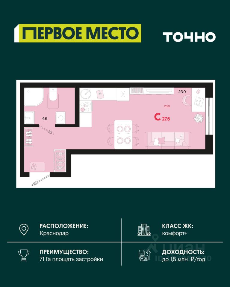 Жилой район ''Первое место''- один из самых масштабных проектов в России. На территории 71 га 18 кварталов, 31 дом переменной этажности от 8 до 18 этажей, собственный парк 9 га, храмовый комплекс, пешеходный бульвар ''Круг семьи'', детские и спортивные площадки, мангальные зоны и различные локации для отдыха. В шаговой доступности действующие муниципальные образовательные учреждения: школа на 1 100 мест и детский сад на 250 мест. Помимо этого, в жилом районе ''Первое место'' построятся школа на 1700 мест с крытым 25-метровым бассейном и 5 детских садов на 1 490 мест. На первых этажах многоуровневых парковок ''паркхабов'' разместится более 61 тыс м2 коммерческих помещений. Жителям будут доступны собственный фитнес-центр, кафе, рестораны и магазины. В каждом подъезде предусмотрены дизайнерские холлы в стиле лобби отелей, консьерж-сервис, лапомойки, отдельные колясочные и велосипедные. Также в домах будут просторные кладовые помещения и комнаты для хранения почты с почтоматами для получения посылок из маркетплейсов.