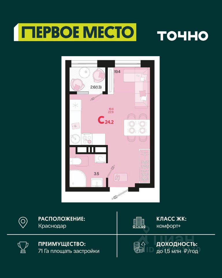 Жилой район ''Первое место''- один из самых масштабных проектов в России. На территории 71 га 18 кварталов, 31 дом переменной этажности от 8 до 18 этажей, собственный парк 9 га, храмовый комплекс, пешеходный бульвар ''Круг семьи'', детские и спортивные площадки, мангальные зоны и различные локации для отдыха. В шаговой доступности действующие муниципальные образовательные учреждения: школа на 1 100 мест и детский сад на 250 мест. Помимо этого, в жилом районе ''Первое место'' построятся школа на 1700 мест с крытым 25-метровым бассейном и 5 детских садов на 1 490 мест. На первых этажах многоуровневых парковок ''паркхабов'' разместится более 61 тыс м2 коммерческих помещений. Жителям будут доступны собственный фитнес-центр, кафе, рестораны и магазины. В каждом подъезде предусмотрены дизайнерские холлы в стиле лобби отелей, консьерж-сервис, лапомойки, отдельные колясочные и велосипедные. Также в домах будут просторные кладовые помещения и комнаты для хранения почты с почтоматами для получения посылок из маркетплейсов.