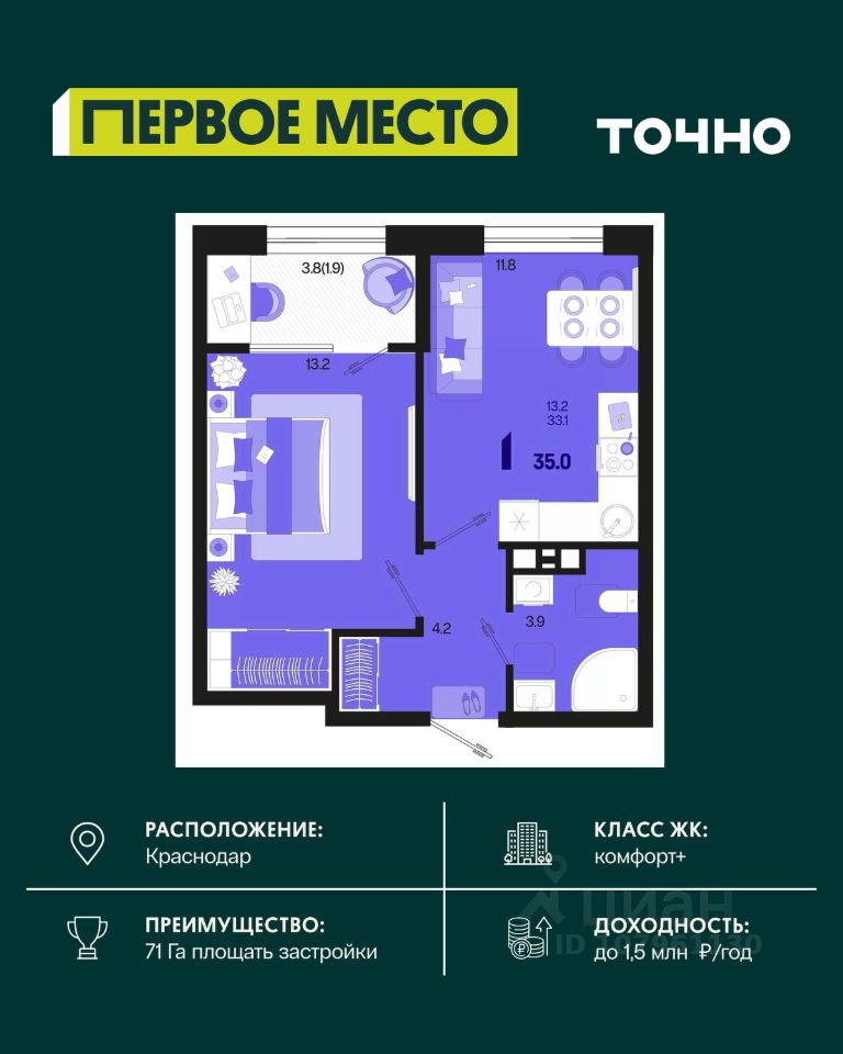 Жилой район ''Первое место''- один из самых масштабных проектов в России. На территории 71 га 18 кварталов, 31 дом переменной этажности от 8 до 18 этажей, собственный парк 9 га, храмовый комплекс, пешеходный бульвар ''Круг семьи'', детские и спортивные площадки, мангальные зоны и различные локации для отдыха. В шаговой доступности действующие муниципальные образовательные учреждения: школа на 1 100 мест и детский сад на 250 мест. Помимо этого, в жилом районе ''Первое место'' построятся школа на 1700 мест с крытым 25-метровым бассейном и 5 детских садов на 1 490 мест. На первых этажах многоуровневых парковок ''паркхабов'' разместится более 61 тыс м2 коммерческих помещений. Жителям будут доступны собственный фитнес-центр, кафе, рестораны и магазины. В каждом подъезде предусмотрены дизайнерские холлы в стиле лобби отелей, консьерж-сервис, лапомойки, отдельные колясочные и велосипедные. Также в домах будут просторные кладовые помещения и комнаты для хранения почты с почтоматами для получения посылок из маркетплейсов.