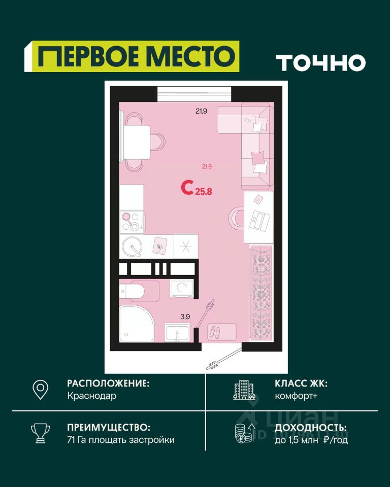 Жилой район ''Первое место''- один из самых масштабных проектов в России. На территории 71 га 18 кварталов, 31 дом переменной этажности от 8 до 18 этажей, собственный парк 9 га, храмовый комплекс, пешеходный бульвар ''Круг семьи'', детские и спортивные площадки, мангальные зоны и различные локации для отдыха. В шаговой доступности действующие муниципальные образовательные учреждения: школа на 1 100 мест и детский сад на 250 мест. Помимо этого, в жилом районе ''Первое место'' построятся школа на 1700 мест с крытым 25-метровым бассейном и 5 детских садов на 1 490 мест. На первых этажах многоуровневых парковок ''паркхабов'' разместится более 61 тыс м2 коммерческих помещений. Жителям будут доступны собственный фитнес-центр, кафе, рестораны и магазины. В каждом подъезде предусмотрены дизайнерские холлы в стиле лобби отелей, консьерж-сервис, лапомойки, отдельные колясочные и велосипедные. Также в домах будут просторные кладовые помещения и комнаты для хранения почты с почтоматами для получения посылок из маркетплейсов.