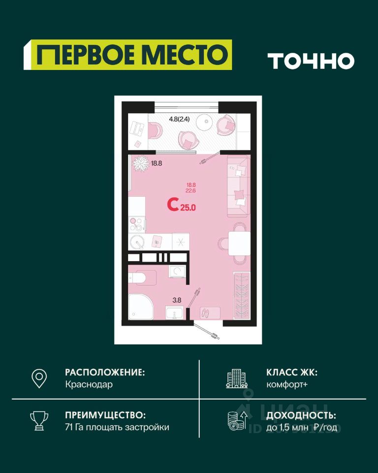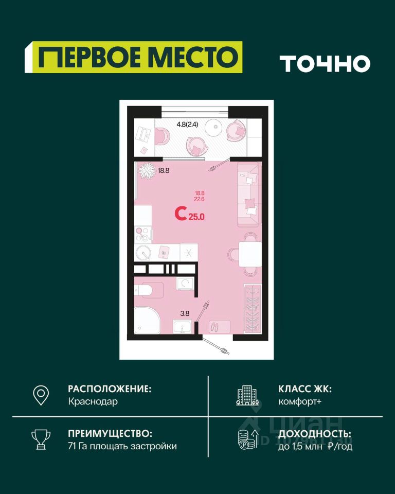 Жилой район ''Первое место''- один из самых масштабных проектов в России. На территории 71 га 18 кварталов, 31 дом переменной этажности от 8 до 18 этажей, собственный парк 9 га, храмовый комплекс, пешеходный бульвар ''Круг семьи'', детские и спортивные площадки, мангальные зоны и различные локации для отдыха. В шаговой доступности действующие муниципальные образовательные учреждения: школа на 1 100 мест и детский сад на 250 мест. Помимо этого, в жилом районе ''Первое место'' построятся школа на 1700 мест с крытым 25-метровым бассейном и 5 детских садов на 1 490 мест. На первых этажах многоуровневых парковок ''паркхабов'' разместится более 61 тыс м2 коммерческих помещений. Жителям будут доступны собственный фитнес-центр, кафе, рестораны и магазины. В каждом подъезде предусмотрены дизайнерские холлы в стиле лобби отелей, консьерж-сервис, лапомойки, отдельные колясочные и велосипедные. Также в домах будут просторные кладовые помещения и комнаты для хранения почты с почтоматами для получения посылок из маркетплейсов.