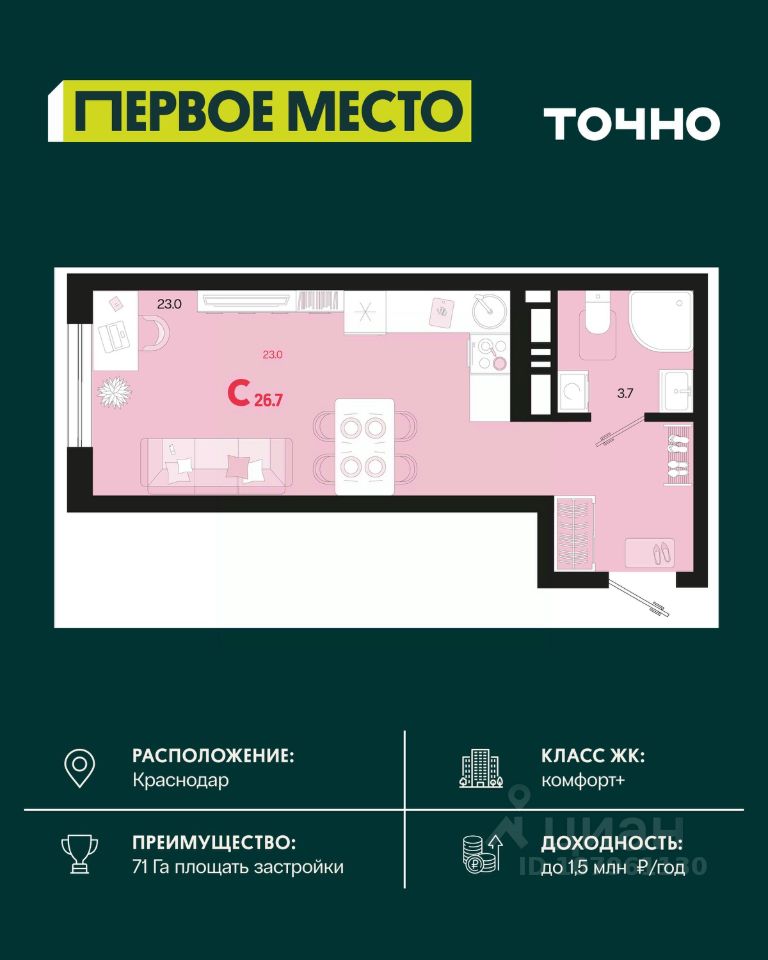 Жилой район ''Первое место''- один из самых масштабных проектов в России. На территории 71 га 18 кварталов, 31 дом переменной этажности от 8 до 18 этажей, собственный парк 9 га, храмовый комплекс, пешеходный бульвар ''Круг семьи'', детские и спортивные площадки, мангальные зоны и различные локации для отдыха. В шаговой доступности действующие муниципальные образовательные учреждения: школа на 1 100 мест и детский сад на 250 мест. Помимо этого, в жилом районе ''Первое место'' построятся школа на 1700 мест с крытым 25-метровым бассейном и 5 детских садов на 1 490 мест. На первых этажах многоуровневых парковок ''паркхабов'' разместится более 61 тыс м2 коммерческих помещений. Жителям будут доступны собственный фитнес-центр, кафе, рестораны и магазины. В каждом подъезде предусмотрены дизайнерские холлы в стиле лобби отелей, консьерж-сервис, лапомойки, отдельные колясочные и велосипедные. Также в домах будут просторные кладовые помещения и комнаты для хранения почты с почтоматами для получения посылок из маркетплейсов.