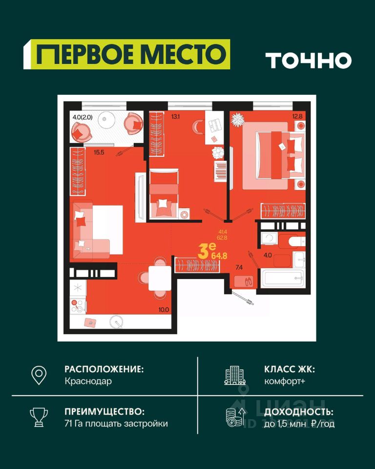 Жилой район ''Первое место''- один из самых масштабных проектов в России. На территории 71 га 18 кварталов, 31 дом переменной этажности от 8 до 18 этажей, собственный парк 9 га, храмовый комплекс, пешеходный бульвар ''Круг семьи'', детские и спортивные площадки, мангальные зоны и различные локации для отдыха. В шаговой доступности действующие муниципальные образовательные учреждения: школа на 1 100 мест и детский сад на 250 мест. Помимо этого, в жилом районе ''Первое место'' построятся школа на 1700 мест с крытым 25-метровым бассейном и 5 детских садов на 1 490 мест. На первых этажах многоуровневых парковок ''паркхабов'' разместится более 61 тыс м2 коммерческих помещений. Жителям будут доступны собственный фитнес-центр, кафе, рестораны и магазины. В каждом подъезде предусмотрены дизайнерские холлы в стиле лобби отелей, консьерж-сервис, лапомойки, отдельные колясочные и велосипедные. Также в домах будут просторные кладовые помещения и комнаты для хранения почты с почтоматами для получения посылок из маркетплейсов.