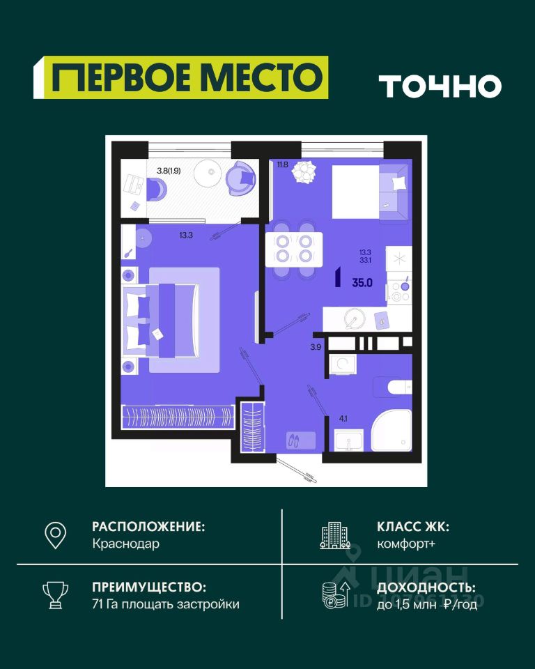Жилой район ''Первое место''- один из самых масштабных проектов в России. На территории 71 га 18 кварталов, 31 дом переменной этажности от 8 до 18 этажей, собственный парк 9 га, храмовый комплекс, пешеходный бульвар ''Круг семьи'', детские и спортивные площадки, мангальные зоны и различные локации для отдыха. В шаговой доступности действующие муниципальные образовательные учреждения: школа на 1 100 мест и детский сад на 250 мест. Помимо этого, в жилом районе ''Первое место'' построятся школа на 1700 мест с крытым 25-метровым бассейном и 5 детских садов на 1 490 мест. На первых этажах многоуровневых парковок ''паркхабов'' разместится более 61 тыс м2 коммерческих помещений. Жителям будут доступны собственный фитнес-центр, кафе, рестораны и магазины. В каждом подъезде предусмотрены дизайнерские холлы в стиле лобби отелей, консьерж-сервис, лапомойки, отдельные колясочные и велосипедные. Также в домах будут просторные кладовые помещения и комнаты для хранения почты с почтоматами для получения посылок из маркетплейсов.