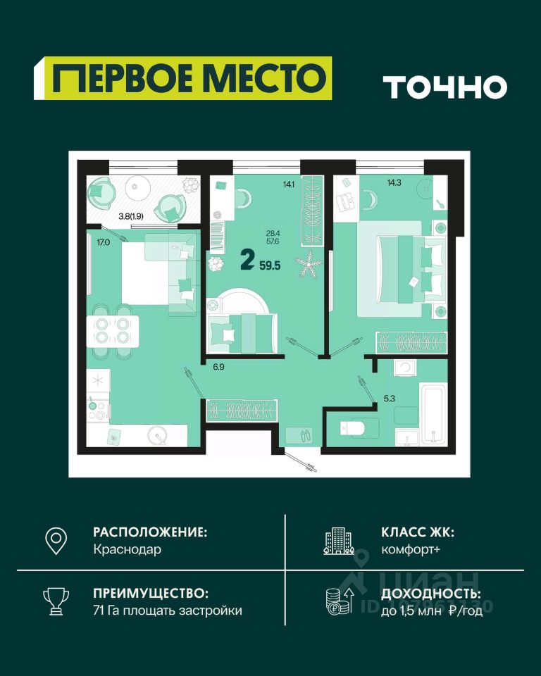 продам 2-к, Виктора Казанцева, 1.28 032 500 ₽