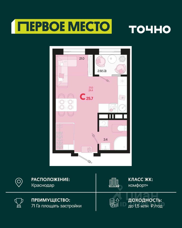 Жилой район ''Первое место''- один из самых масштабных проектов в России. На территории 71 га 18 кварталов, 31 дом переменной этажности от 8 до 18 этажей, собственный парк 9 га, храмовый комплекс, пешеходный бульвар ''Круг семьи'', детские и спортивные площадки, мангальные зоны и различные локации для отдыха. В шаговой доступности действующие муниципальные образовательные учреждения: школа на 1 100 мест и детский сад на 250 мест. Помимо этого, в жилом районе ''Первое место'' построятся школа на 1700 мест с крытым 25-метровым бассейном и 5 детских садов на 1 490 мест. На первых этажах многоуровневых парковок ''паркхабов'' разместится более 61 тыс м2 коммерческих помещений. Жителям будут доступны собственный фитнес-центр, кафе, рестораны и магазины. В каждом подъезде предусмотрены дизайнерские холлы в стиле лобби отелей, консьерж-сервис, лапомойки, отдельные колясочные и велосипедные. Также в домах будут просторные кладовые помещения и комнаты для хранения почты с почтоматами для получения посылок из маркетплейсов.