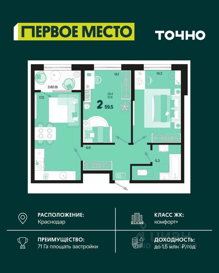 Общая площадь59,5 м2