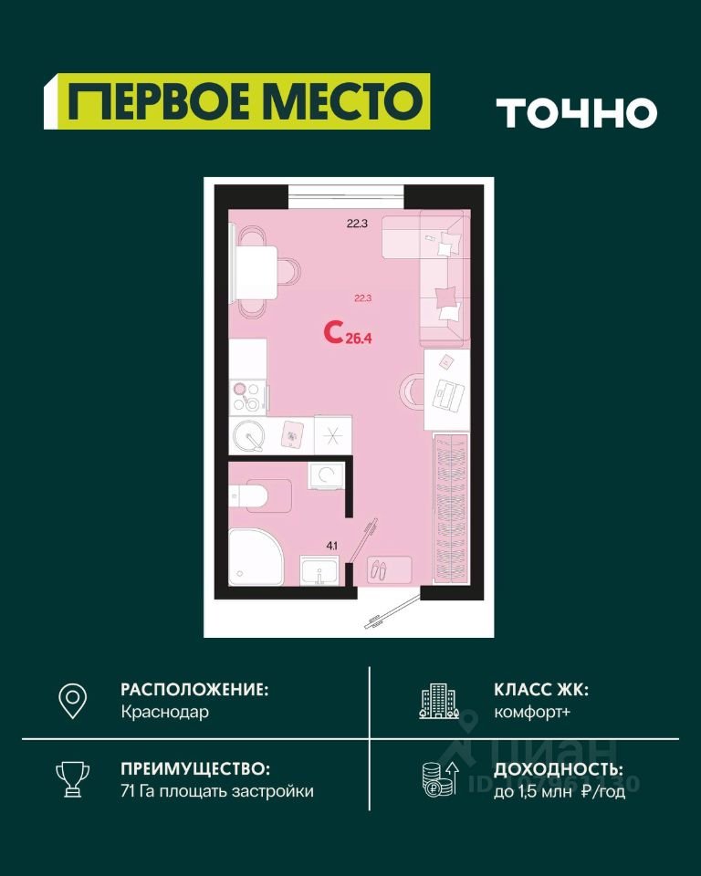 Жилой район ''Первое место''- один из самых масштабных проектов в России. На территории 71 га 18 кварталов, 31 дом переменной этажности от 8 до 18 этажей, собственный парк 9 га, храмовый комплекс, пешеходный бульвар ''Круг семьи'', детские и спортивные площадки, мангальные зоны и различные локации для отдыха. В шаговой доступности действующие муниципальные образовательные учреждения: школа на 1 100 мест и детский сад на 250 мест. Помимо этого, в жилом районе ''Первое место'' построятся школа на 1700 мест с крытым 25-метровым бассейном и 5 детских садов на 1 490 мест. На первых этажах многоуровневых парковок ''паркхабов'' разместится более 61 тыс м2 коммерческих помещений. Жителям будут доступны собственный фитнес-центр, кафе, рестораны и магазины. В каждом подъезде предусмотрены дизайнерские холлы в стиле лобби отелей, консьерж-сервис, лапомойки, отдельные колясочные и велосипедные. Также в домах будут просторные кладовые помещения и комнаты для хранения почты с почтоматами для получения посылок из маркетплейсов.