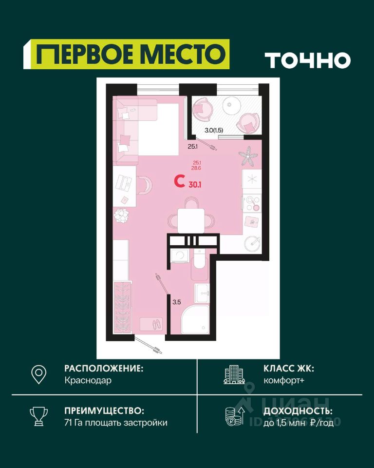 Жилой район ''Первое место''- один из самых масштабных проектов в России. На территории 71 га 18 кварталов, 31 дом переменной этажности от 8 до 18 этажей, собственный парк 9 га, храмовый комплекс, пешеходный бульвар ''Круг семьи'', детские и спортивные площадки, мангальные зоны и различные локации для отдыха. В шаговой доступности действующие муниципальные образовательные учреждения: школа на 1 100 мест и детский сад на 250 мест. Помимо этого, в жилом районе ''Первое место'' построятся школа на 1700 мест с крытым 25-метровым бассейном и 5 детских садов на 1 490 мест. На первых этажах многоуровневых парковок ''паркхабов'' разместится более 61 тыс м2 коммерческих помещений. Жителям будут доступны собственный фитнес-центр, кафе, рестораны и магазины. В каждом подъезде предусмотрены дизайнерские холлы в стиле лобби отелей, консьерж-сервис, лапомойки, отдельные колясочные и велосипедные. Также в домах будут просторные кладовые помещения и комнаты для хранения почты с почтоматами для получения посылок из маркетплейсов.