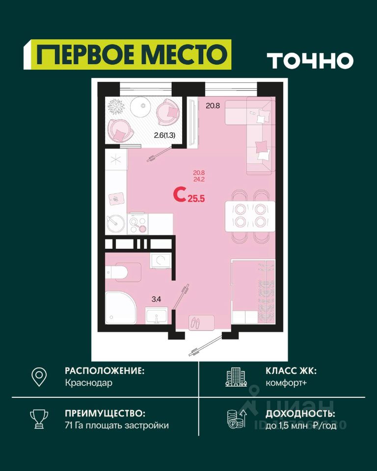 Жилой район ''Первое место''- один из самых масштабных проектов в России. На территории 71 га 18 кварталов, 31 дом переменной этажности от 8 до 18 этажей, собственный парк 9 га, храмовый комплекс, пешеходный бульвар ''Круг семьи'', детские и спортивные площадки, мангальные зоны и различные локации для отдыха. В шаговой доступности действующие муниципальные образовательные учреждения: школа на 1 100 мест и детский сад на 250 мест. Помимо этого, в жилом районе ''Первое место'' построятся школа на 1700 мест с крытым 25-метровым бассейном и 5 детских садов на 1 490 мест. На первых этажах многоуровневых парковок ''паркхабов'' разместится более 61 тыс м2 коммерческих помещений. Жителям будут доступны собственный фитнес-центр, кафе, рестораны и магазины. В каждом подъезде предусмотрены дизайнерские холлы в стиле лобби отелей, консьерж-сервис, лапомойки, отдельные колясочные и велосипедные. Также в домах будут просторные кладовые помещения и комнаты для хранения почты с почтоматами для получения посылок из маркетплейсов.