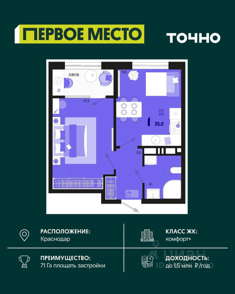 Жилой район ''Первое место''- один из самых масштабных проектов в России. На территории 71 га 18 кварталов, 31 дом переменной этажности от 8 до 18 этажей, собственный парк 9 га, храмовый комплекс, пешеходный бульвар ''Круг семьи'', детские и спортивные площадки, мангальные зоны и различные локации для отдыха. В шаговой доступности действующие муниципальные образовательные учреждения: школа на 1 100 мест и детский сад на 250 мест. Помимо этого, в жилом районе ''Первое место'' построятся школа на 1700 мест с крытым 25-метровым бассейном и 5 детских садов на 1 490 мест. На первых этажах многоуровневых парковок ''паркхабов'' разместится более 61 тыс м2 коммерческих помещений. Жителям будут доступны собственный фитнес-центр, кафе, рестораны и магазины. В каждом подъезде предусмотрены дизайнерские холлы в стиле лобби отелей, консьерж-сервис, лапомойки, отдельные колясочные и велосипедные. Также в домах будут просторные кладовые помещения и комнаты для хранения почты с почтоматами для получения посылок из маркетплейсов.