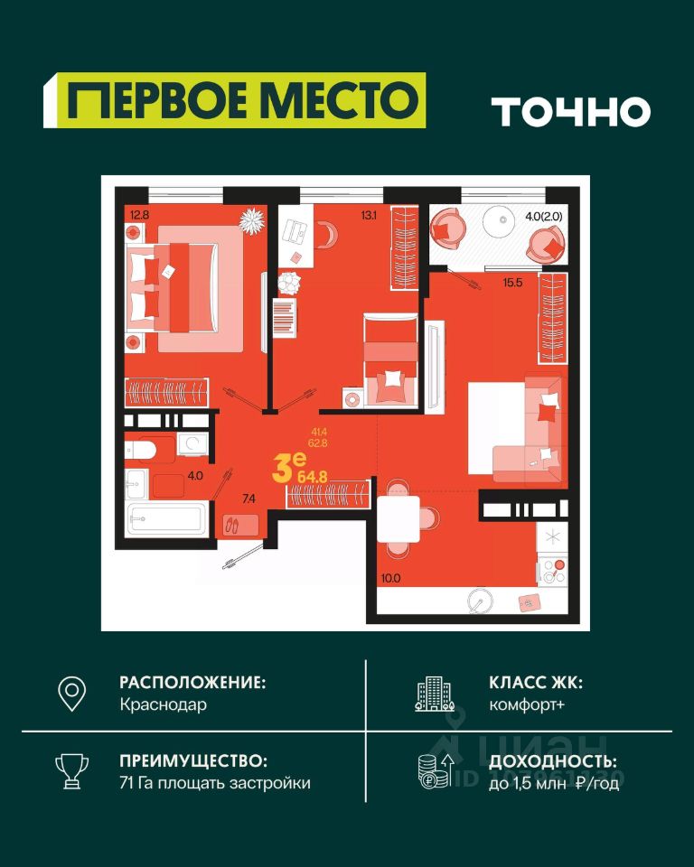 Жилой район ''Первое место''- один из самых масштабных проектов в России. На территории 71 га 18 кварталов, 31 дом переменной этажности от 8 до 18 этажей, собственный парк 9 га, храмовый комплекс, пешеходный бульвар ''Круг семьи'', детские и спортивные площадки, мангальные зоны и различные локации для отдыха. В шаговой доступности действующие муниципальные образовательные учреждения: школа на 1 100 мест и детский сад на 250 мест. Помимо этого, в жилом районе ''Первое место'' построятся школа на 1700 мест с крытым 25-метровым бассейном и 5 детских садов на 1 490 мест. На первых этажах многоуровневых парковок ''паркхабов'' разместится более 61 тыс м2 коммерческих помещений. Жителям будут доступны собственный фитнес-центр, кафе, рестораны и магазины. В каждом подъезде предусмотрены дизайнерские холлы в стиле лобби отелей, консьерж-сервис, лапомойки, отдельные колясочные и велосипедные. Также в домах будут просторные кладовые помещения и комнаты для хранения почты с почтоматами для получения посылок из маркетплейсов.