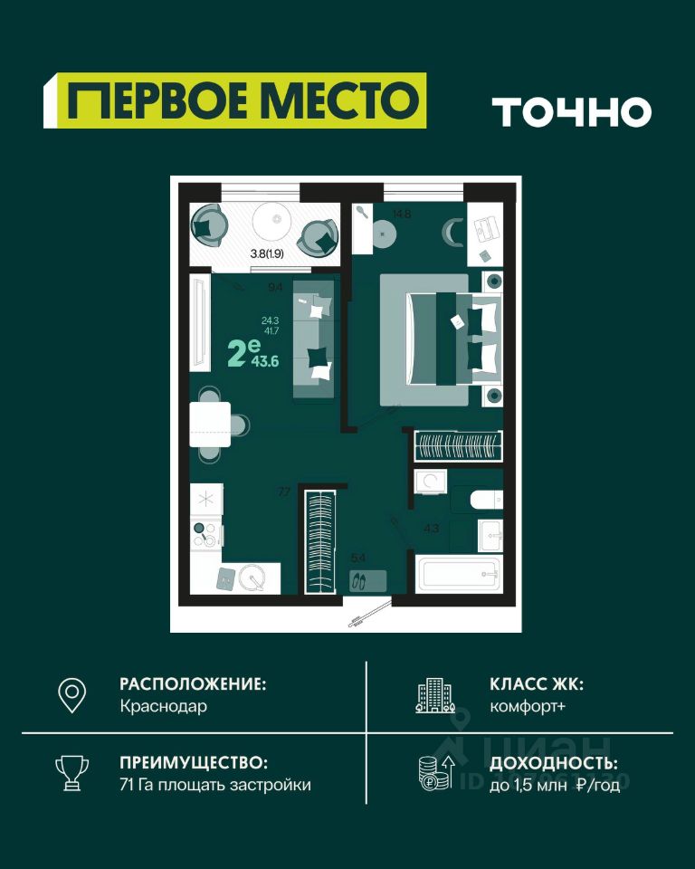 Жилой район ''Первое место''- один из самых масштабных проектов в России. На территории 71 га 18 кварталов, 31 дом переменной этажности от 8 до 18 этажей, собственный парк 9 га, храмовый комплекс, пешеходный бульвар ''Круг семьи'', детские и спортивные площадки, мангальные зоны и различные локации для отдыха. В шаговой доступности действующие муниципальные образовательные учреждения: школа на 1 100 мест и детский сад на 250 мест. Помимо этого, в жилом районе ''Первое место'' построятся школа на 1700 мест с крытым 25-метровым бассейном и 5 детских садов на 1 490 мест. На первых этажах многоуровневых парковок ''паркхабов'' разместится более 61 тыс м2 коммерческих помещений. Жителям будут доступны собственный фитнес-центр, кафе, рестораны и магазины. В каждом подъезде предусмотрены дизайнерские холлы в стиле лобби отелей, консьерж-сервис, лапомойки, отдельные колясочные и велосипедные. Также в домах будут просторные кладовые помещения и комнаты для хранения почты с почтоматами для получения посылок из маркетплейсов.