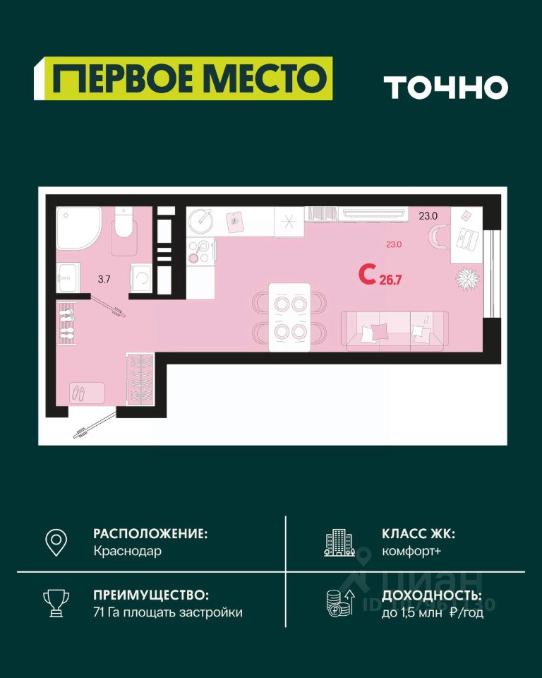 Жилой район ''Первое место''- один из самых масштабных проектов в России. На территории 71 га 18 кварталов, 31 дом переменной этажности от 8 до 18 этажей, собственный парк 9 га, храмовый комплекс, пешеходный бульвар ''Круг семьи'', детские и спортивные площадки, мангальные зоны и различные локации для отдыха. В шаговой доступности действующие муниципальные образовательные учреждения: школа на 1 100 мест и детский сад на 250 мест. Помимо этого, в жилом районе ''Первое место'' построятся школа на 1700 мест с крытым 25-метровым бассейном и 5 детских садов на 1 490 мест. На первых этажах многоуровневых парковок ''паркхабов'' разместится более 61 тыс м2 коммерческих помещений. Жителям будут доступны собственный фитнес-центр, кафе, рестораны и магазины. В каждом подъезде предусмотрены дизайнерские холлы в стиле лобби отелей, консьерж-сервис, лапомойки, отдельные колясочные и велосипедные. Также в домах будут просторные кладовые помещения и комнаты для хранения почты с почтоматами для получения посылок из маркетплейсов.