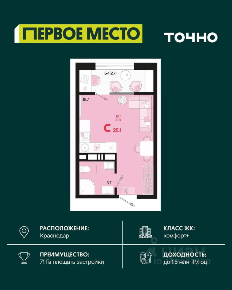 Жилой район ''Первое место''- один из самых масштабных проектов в России. На территории 71 га 18 кварталов, 31 дом переменной этажности от 8 до 18 этажей, собственный парк 9 га, храмовый комплекс, пешеходный бульвар ''Круг семьи'', детские и спортивные площадки, мангальные зоны и различные локации для отдыха. В шаговой доступности действующие муниципальные образовательные учреждения: школа на 1 100 мест и детский сад на 250 мест. Помимо этого, в жилом районе ''Первое место'' построятся школа на 1700 мест с крытым 25-метровым бассейном и 5 детских садов на 1 490 мест. На первых этажах многоуровневых парковок ''паркхабов'' разместится более 61 тыс м2 коммерческих помещений. Жителям будут доступны собственный фитнес-центр, кафе, рестораны и магазины. В каждом подъезде предусмотрены дизайнерские холлы в стиле лобби отелей, консьерж-сервис, лапомойки, отдельные колясочные и велосипедные. Также в домах будут просторные кладовые помещения и комнаты для хранения почты с почтоматами для получения посылок из маркетплейсов.