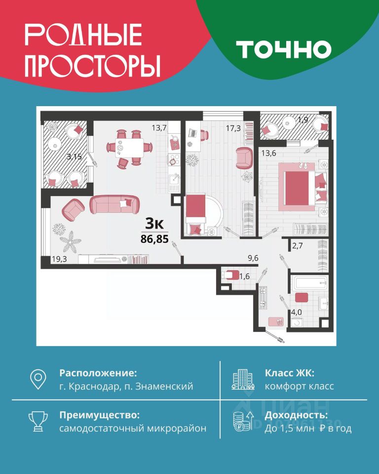 ''Родные просторы''- самодостаточный микрорайон, который реализован по принципу комплексного развития территории, где есть вся инфраструктура для комфортной жизни. На территории 41 га 29 домов от 9 до 24 этажей, уютные дворы со спортивными и игровыми площадками, социальные и коммерческие объекты, зеленые массивы и фонтаны. Главная точка притяжения ''Родных просторов'' - парк семейного отдыха площадью 9 га, 4,5 км прогулочных аллей, амфитеатр для мероприятий, кинофестивальная площадка. Особая гордость микрорайона современная школа на 1550 мест и 3 детских сада ''Ладушки'', ''Веснушки'' и ''Топотушки'' на 880 малышей. В центре микрорайона строятся фитнес-клуб BALANCE с акватермальным комплексом и собственная поликлиника, площадью более 5000 кв.м.