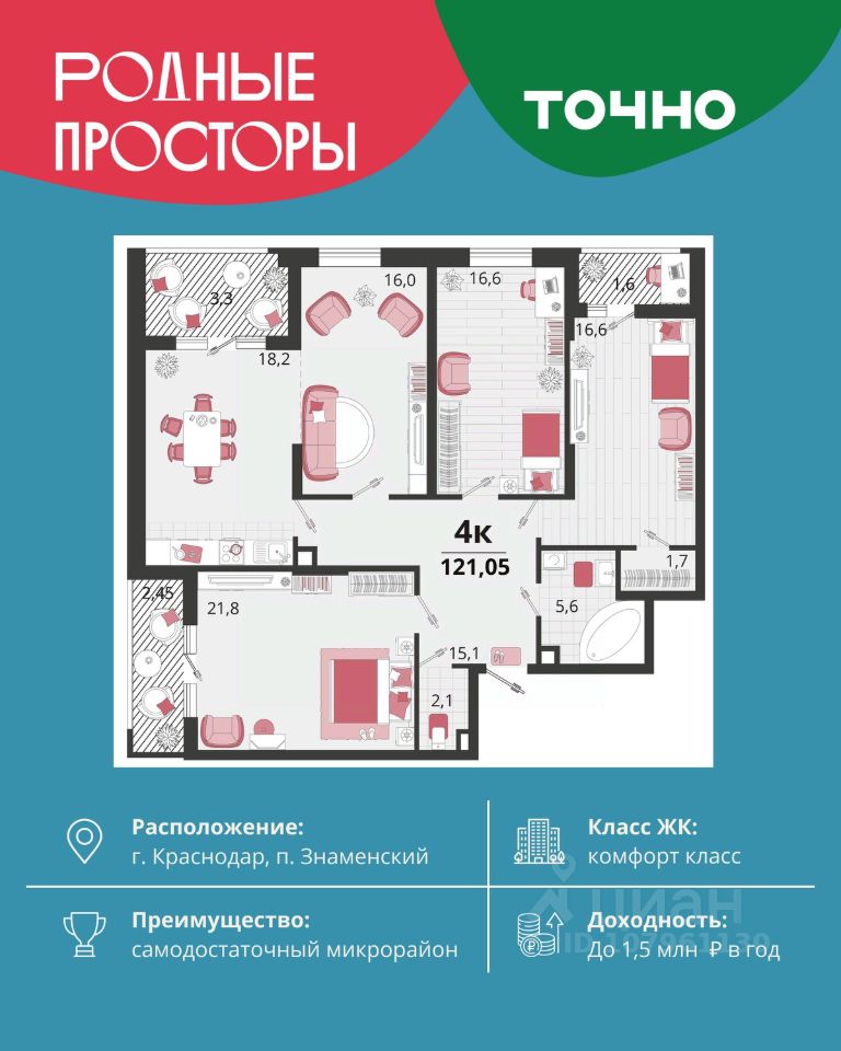 ''Родные просторы''- самодостаточный микрорайон, который реализован по принципу комплексного развития территории, где есть вся инфраструктура для комфортной жизни. На территории 41 га 29 домов от 9 до 24 этажей, уютные дворы со спортивными и игровыми площадками, социальные и коммерческие объекты, зеленые массивы и фонтаны. Главная точка притяжения ''Родных просторов'' - парк семейного отдыха площадью 9 га, 4,5 км прогулочных аллей, амфитеатр для мероприятий, кинофестивальная площадка. Особая гордость микрорайона современная школа на 1550 мест и 3 детских сада ''Ладушки'', ''Веснушки'' и ''Топотушки'' на 880 малышей. В центре микрорайона строятся фитнес-клуб BALANCE с акватермальным комплексом и собственная поликлиника, площадью более 5000 кв.м. Уже открыт православный храм Святых Первоверховных апостолов Петра и Павла.