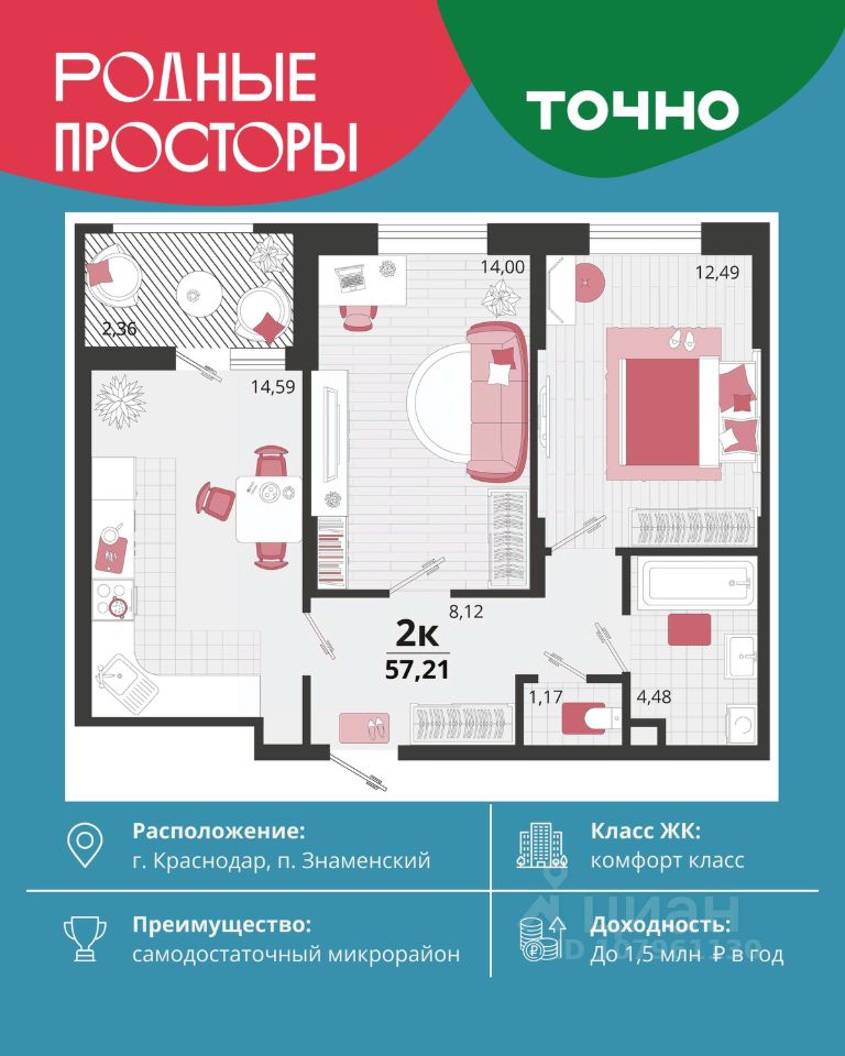 ''Родные просторы''- самодостаточный микрорайон, который реализован по принципу комплексного развития территории, где есть вся инфраструктура для комфортной жизни. На территории 41 га 29 домов от 9 до 24 этажей, уютные дворы со спортивными и игровыми площадками, социальные и коммерческие объекты, зеленые массивы и фонтаны. Главная точка притяжения ''Родных просторов'' - парк семейного отдыха площадью 9 га, 4,5 км прогулочных аллей, амфитеатр для мероприятий, кинофестивальная площадка. Особая гордость микрорайона современная школа на 1550 мест и 3 детских сада ''Ладушки'', ''Веснушки'' и ''Топотушки'' на 880 малышей. В центре микрорайона строятся фитнес-клуб BALANCE с акватермальным комплексом и собственная поликлиника, площадью более 5000 кв.м.