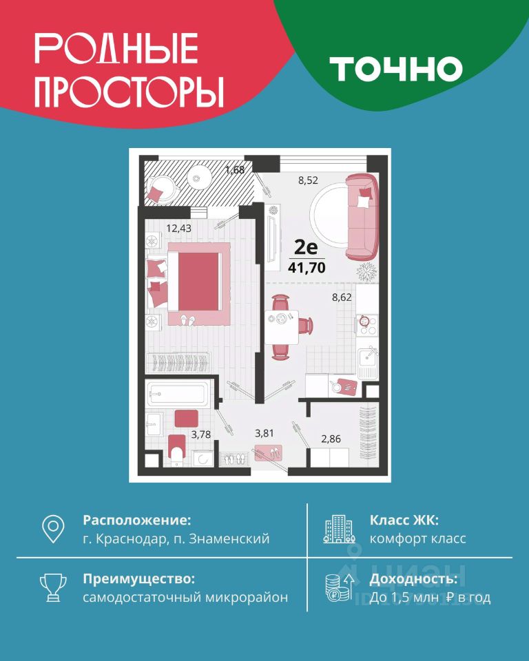''Родные просторы''- самодостаточный микрорайон, который реализован по принципу комплексного развития территории, где есть вся инфраструктура для комфортной жизни. На территории 41 га 29 домов от 9 до 24 этажей, уютные дворы со спортивными и игровыми площадками, социальные и коммерческие объекты, зеленые массивы и фонтаны. Главная точка притяжения ''Родных просторов'' - парк семейного отдыха площадью 9 га, 4,5 км прогулочных аллей, амфитеатр для мероприятий, кинофестивальная площадка. Особая гордость микрорайона современная школа на 1550 мест и 3 детских сада ''Ладушки'', ''Веснушки'' и ''Топотушки'' на 880 малышей. В центре микрорайона строятся фитнес-клуб BALANCE с акватермальным комплексом и собственная поликлиника, площадью более 5000 кв.м.