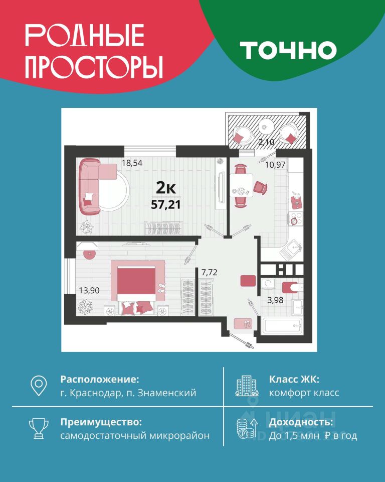 ''Родные просторы''- самодостаточный микрорайон, который реализован по принципу комплексного развития территории, где есть вся инфраструктура для комфортной жизни. На территории 41 га 29 домов от 9 до 24 этажей, уютные дворы со спортивными и игровыми площадками, социальные и коммерческие объекты, зеленые массивы и фонтаны. Главная точка притяжения ''Родных просторов'' - парк семейного отдыха площадью 9 га, 4,5 км прогулочных аллей, амфитеатр для мероприятий, кинофестивальная площадка. Особая гордость микрорайона современная школа на 1550 мест и 3 детских сада ''Ладушки'', ''Веснушки'' и ''Топотушки'' на 880 малышей. В центре микрорайона строятся фитнес-клуб BALANCE с акватермальным комплексом и собственная поликлиника, площадью более 5000 кв.м.