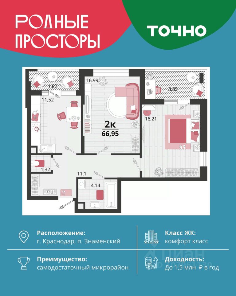 Общая площадь66,95 м2