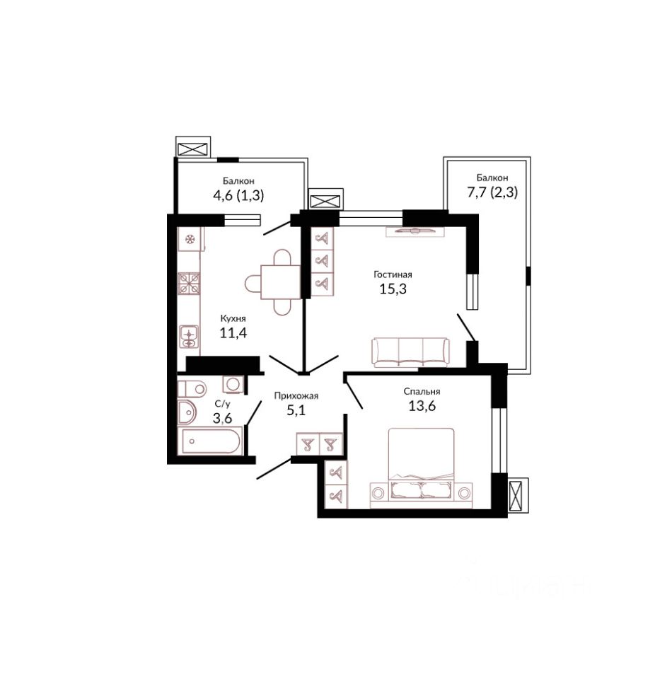Общая площадь54,3 м2