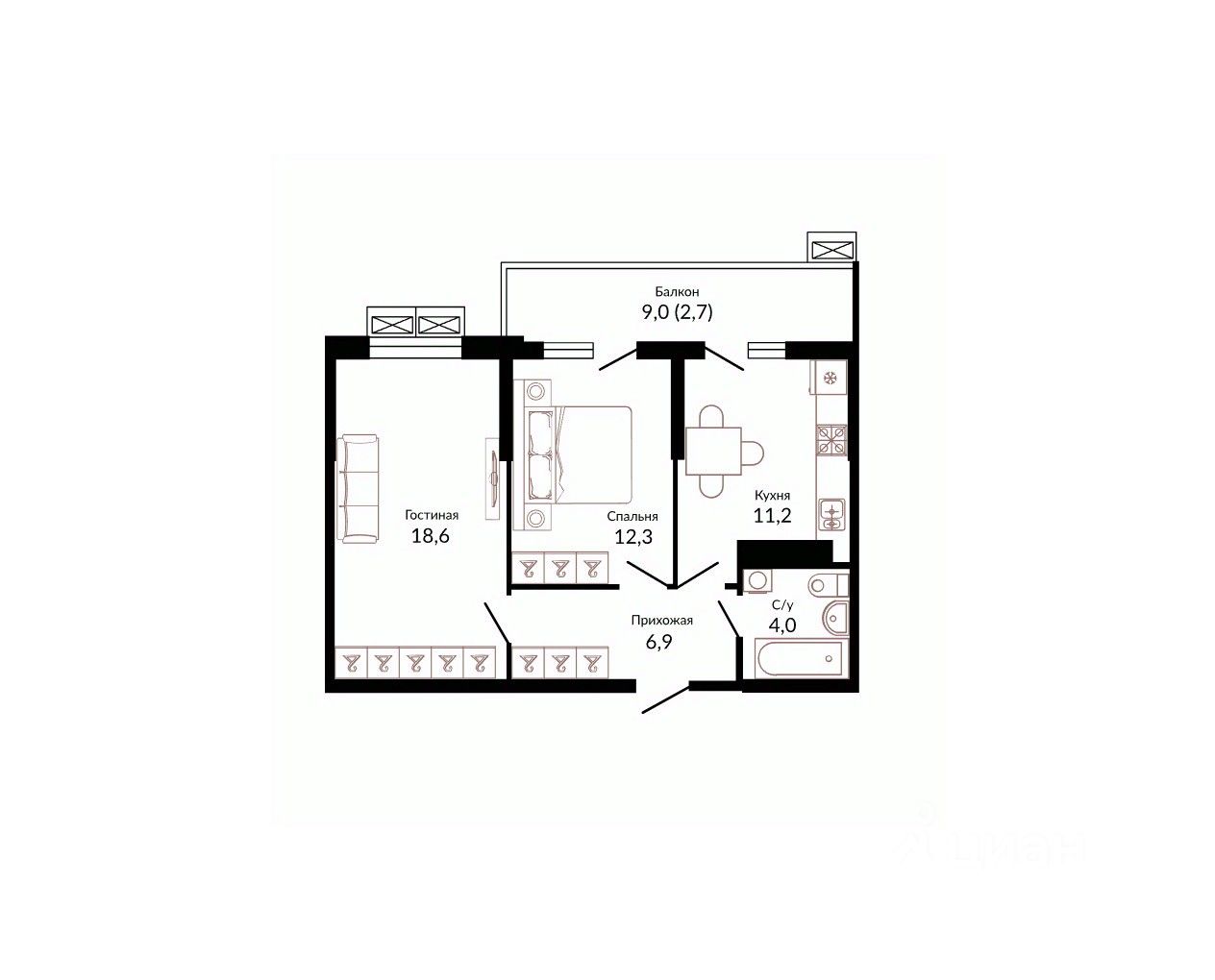 Общая площадь57,3 м2