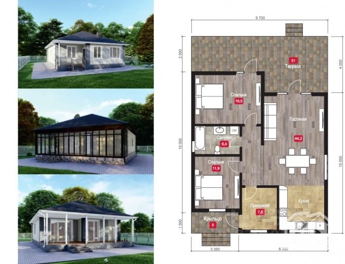 Планировка - две спальни, кухня-гостиная с выходом на террасу 31 кв.м.