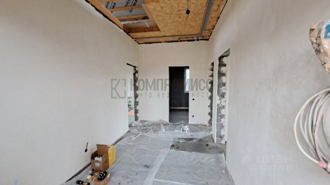 Внутри дома предчистовая отделка: стяжка пола, шпатлевка и штукатурка стен, натяжные потолки со встроенными светильниками, проводка электричества и канализации.