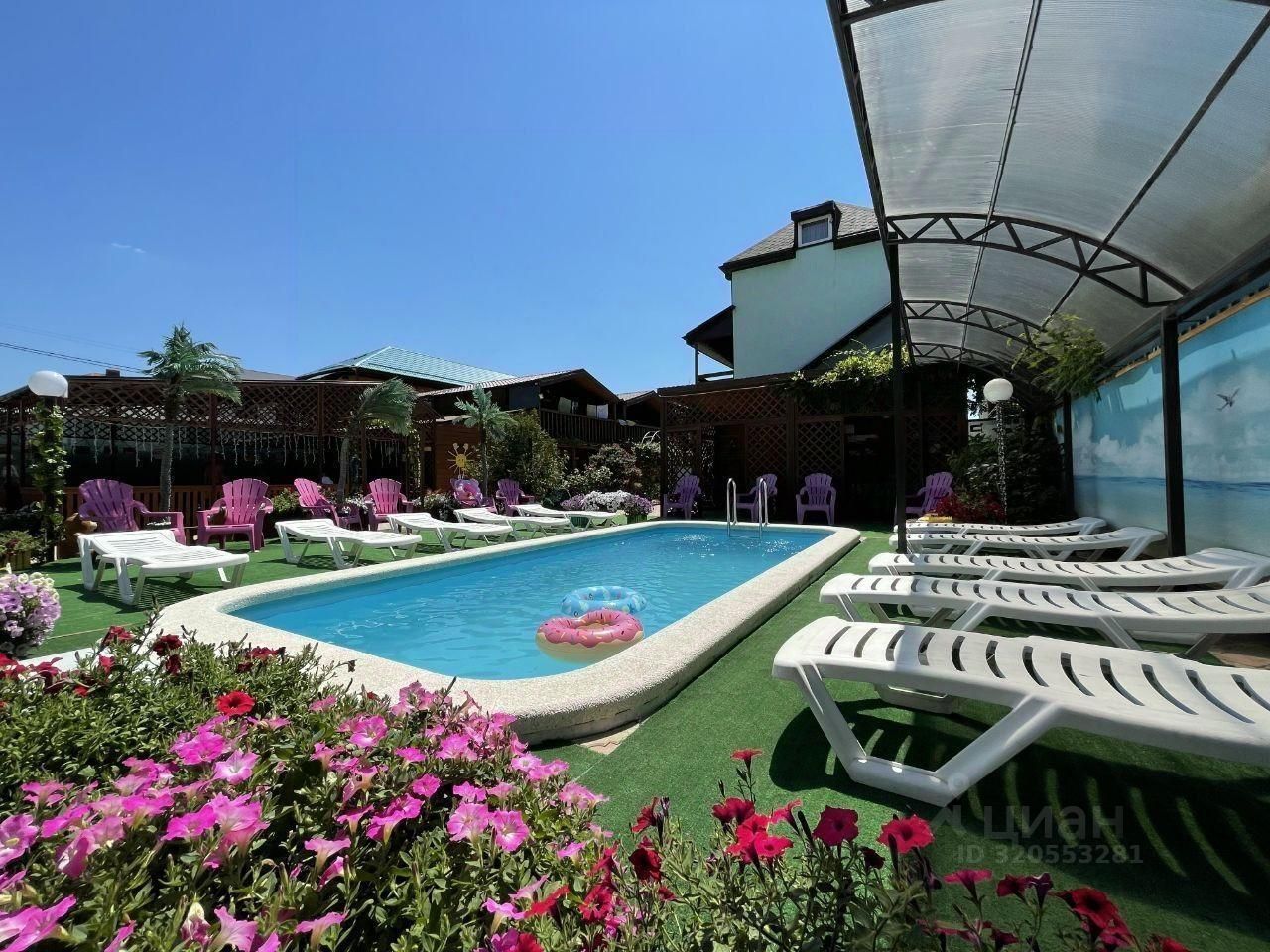 На территории гостевого дома созданы все условия для полноценного отдыха: бассейн с фильтром и подсветкой в ночное время, зона отдыха с лежаками, беседка, детская площадка, качели, декоративные элементы, много зелени, цветов, клумб.