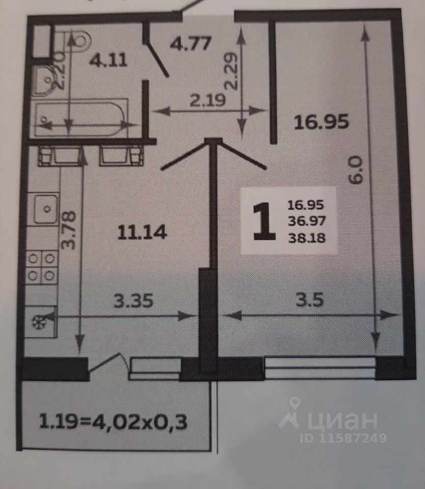Жилая площадь — 16,95 кв.м., кухня-гостиная — 11,14 кв.м., совмещённый санузел, застекленная лоджия с живописным видом на Краснодарское водохранилище.