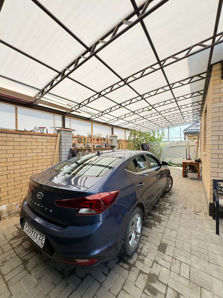 Сделан навес под 2 машины, терраса под навесом, брусчатка.