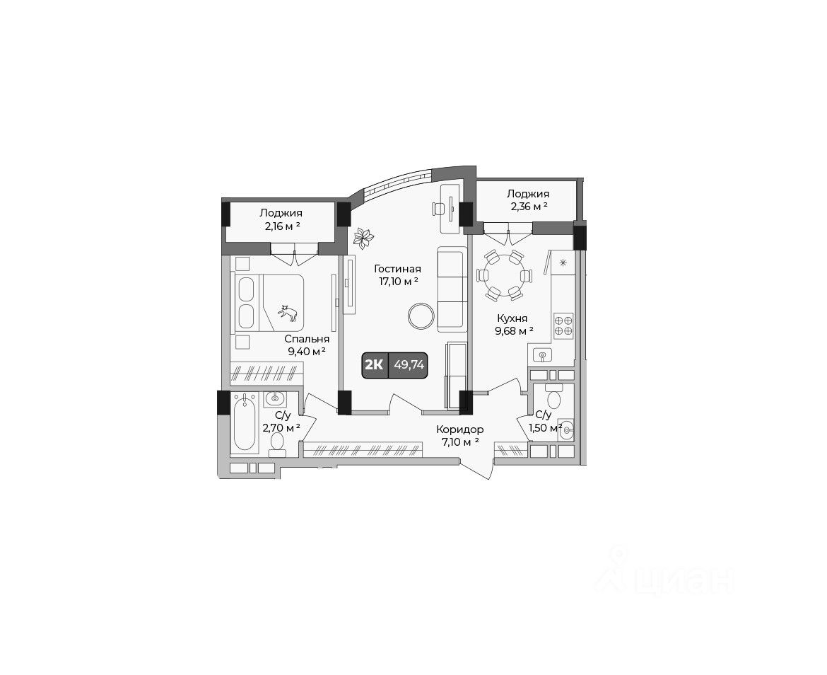 Общая площадь49,74 м2