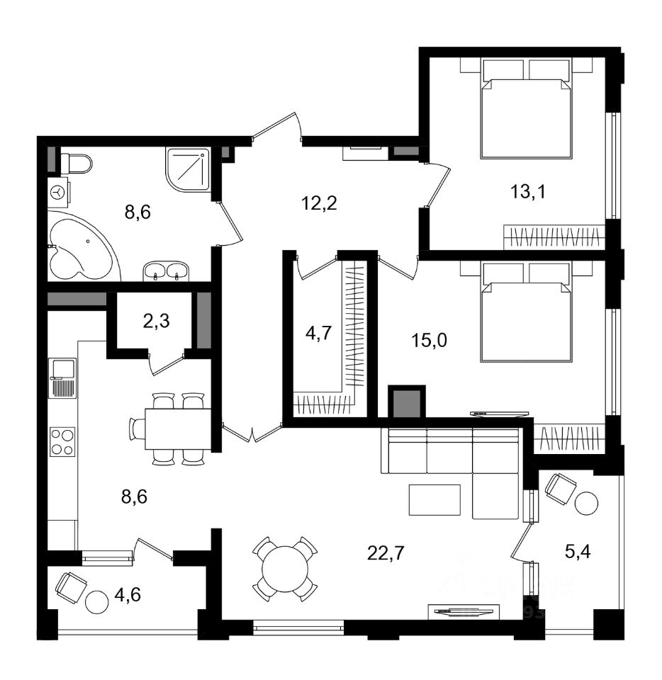 О квартире — Общая площадь с балконами 102.5 кв. м. Без балконов — 92.5 кв.м.