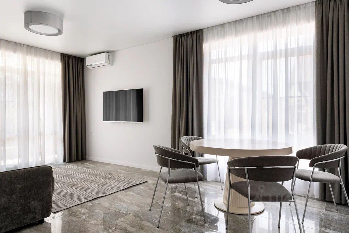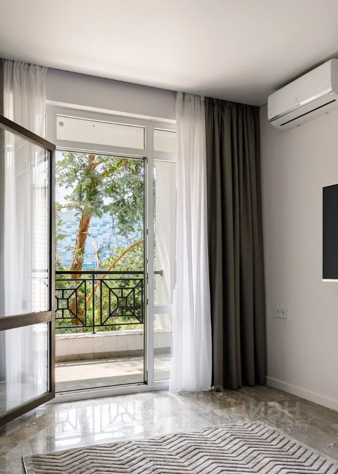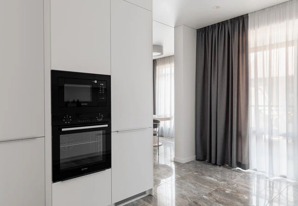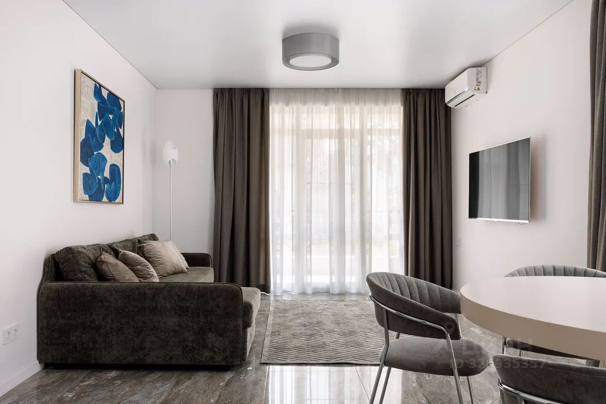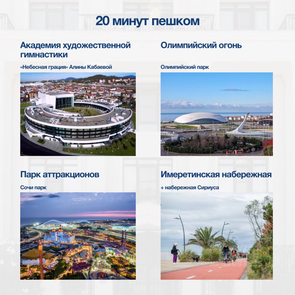 Главные преимущества — Дизайнерский ремонт и стильный минималистичный интерьер. Всё новое, в идеальном состоянии. В квартире никто не жил. Мебель и техника остаются. — Удобная современная планировка. 2 спальни, кухня объединена с гостиной, два балкона, два санузла. Есть кладовая и гардеробная. — Прекрасная локация. 10 минут на машине от аэропорта и 5 минут — до благоустроенного пляжа и набережной. Все достопримечательности Олимпийского парка — в пешей доступности. — Закрытая территория. Тихая улица. Есть лифт. Рядом с домом есть организованная наземная парковка.