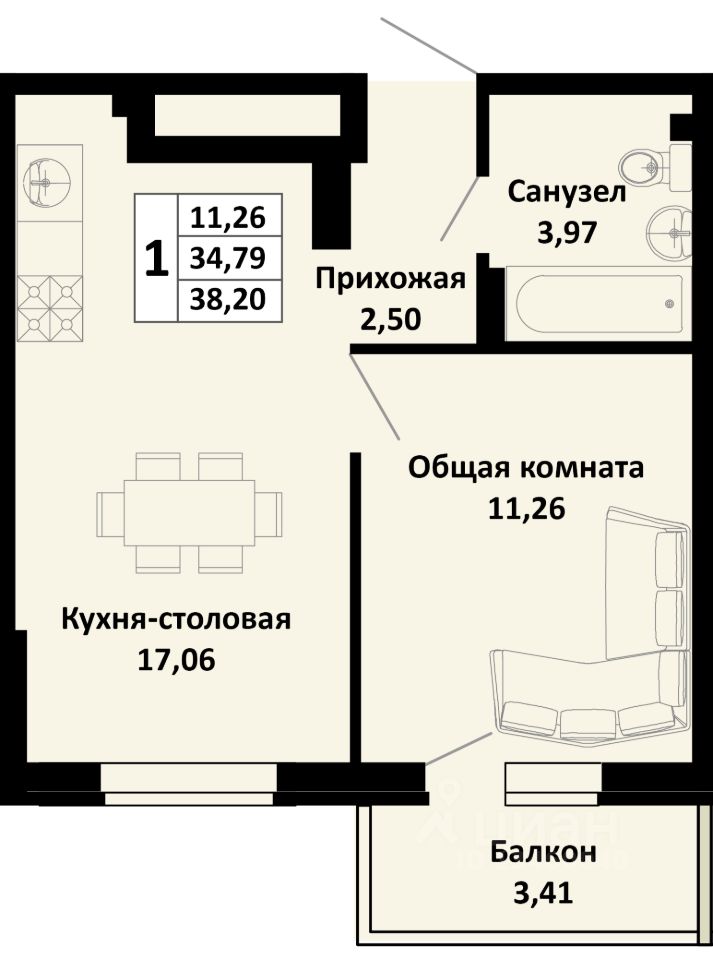 Общая площадь38,2 м2