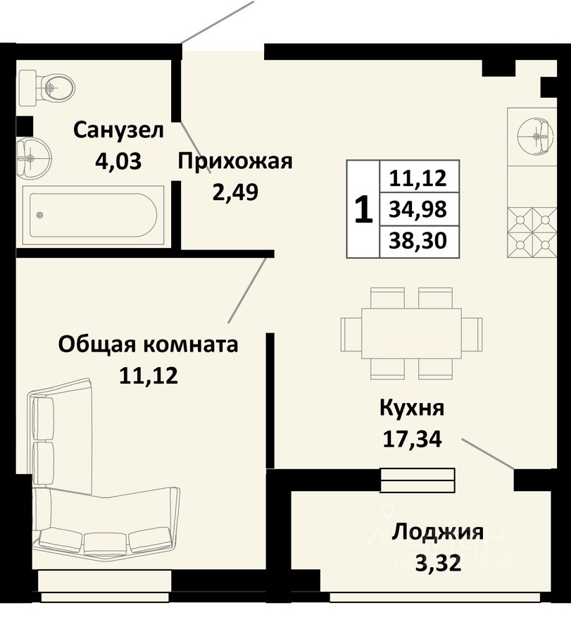 Общая площадь38,3 м2