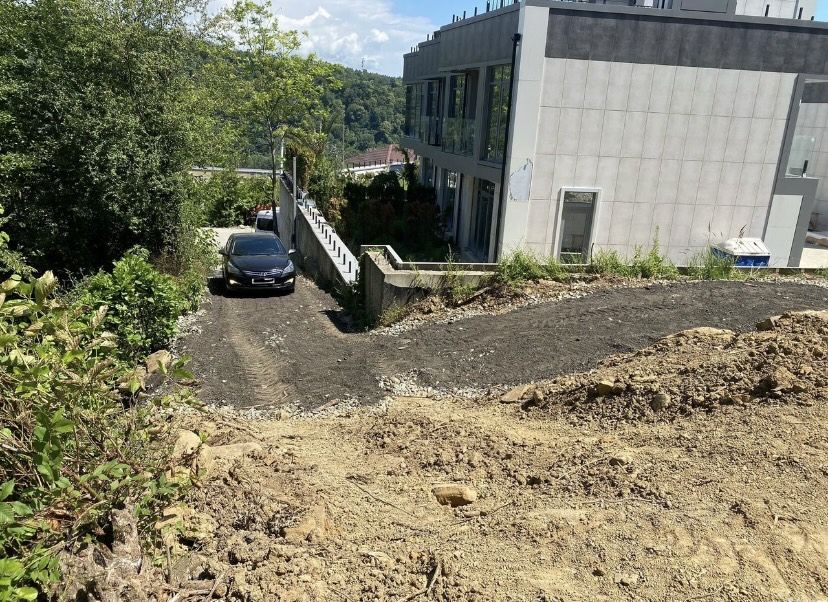 На сам участок проведена дорога, на нижней части участка есть опорная стена.