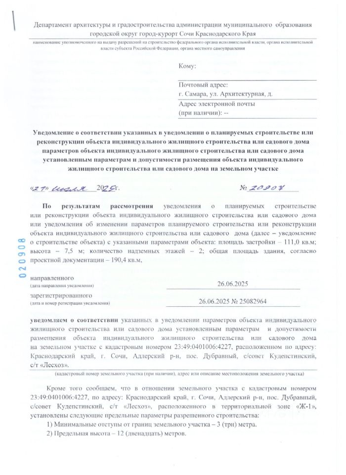 Получено Уведомление о соответствии планируемого строительства, 190 кв.м, 2 эт.