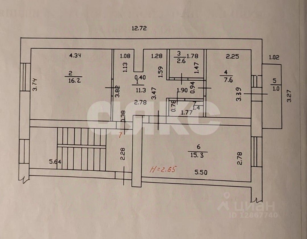 Общая площадь - 54,6 кв. м., Жилая площадь - 31,5 кв. м., Площадь кухни - 7,6 кв. м