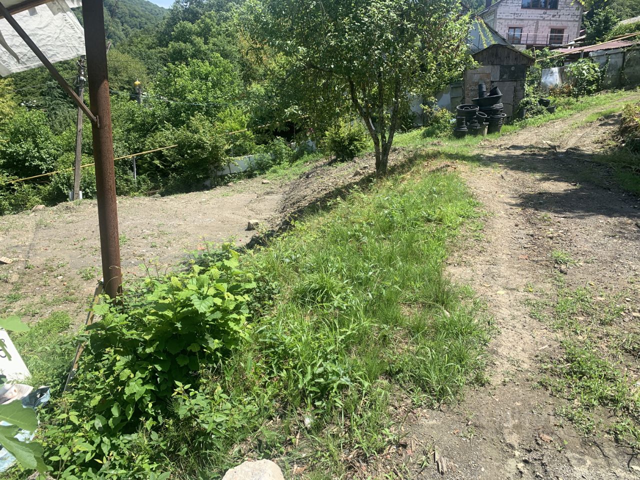 На участке уже есть фундамент и опорная стена. К участку идёт бетонная дорога.