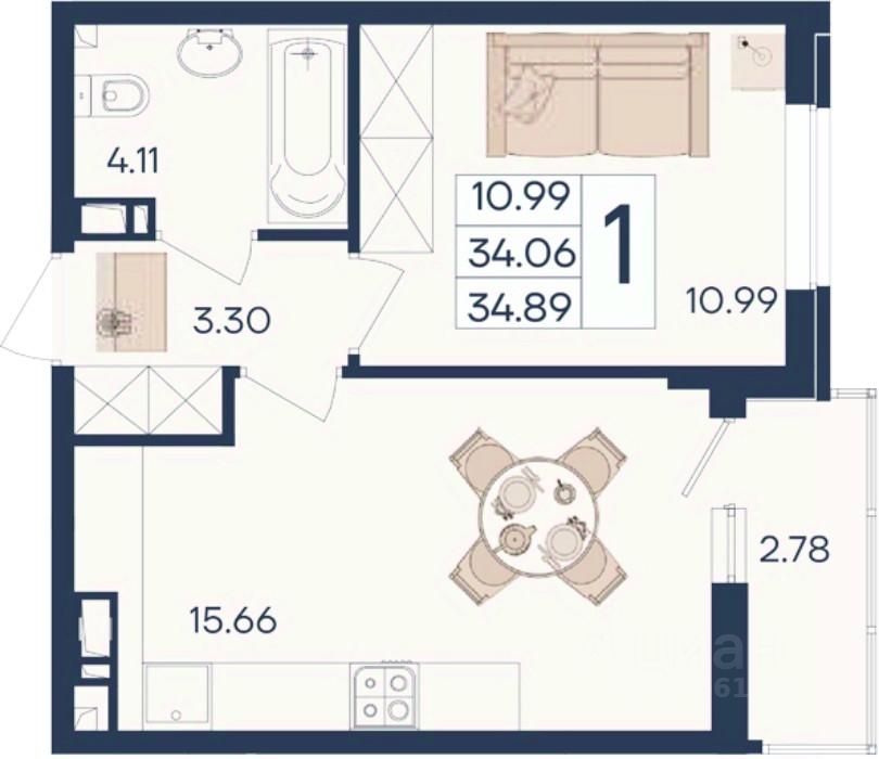 1 комнатная квартира с ремонтом 34.89 м², на 9 этаже в жилом комплексе ''Дом 101''.